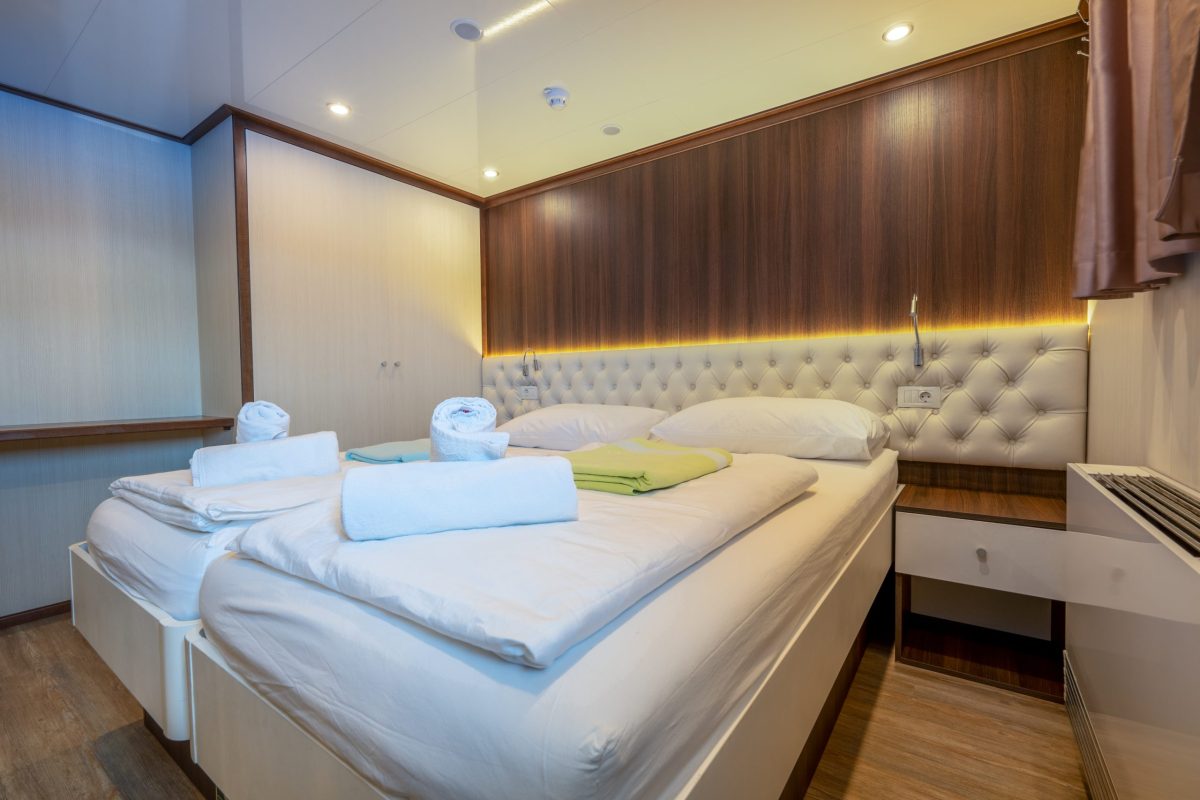 Passenger cabins are situated on two decks while crew members are accommodated in the separate living quarters.