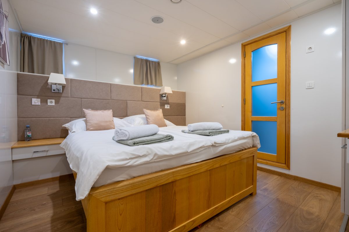 Cabins are made under new standards, each cabin has independent air-condition, central ventilation system, Satellite TV, Safe deposit box, smoke and fire alarm, internal radio system (also for announcements from captain or tour leader), lifejackets, cupboard, cabinet, small table with chair and porthole or window. Luggage space is under the bed. Bathrooms are equipped with toilette, shower, wash basin, hairdryer and cosmetic package. Standard cabins Eight cabins are with double or twin beds and in one of them have third bed (200 x 80 cm) on the floor with size of 14-16 m2. These cabins are equivalent or larger to other cabins in terms of comfort, they are situated under main deck where sea influence and „boat shaking“ is minimized, as well as the noise from city cafe music or other boats during summer nights. Standard cabins have entrance doors from the inside of the ship and have two portholes that cannot be opened due to security reasons, but there is a perfect dual ventilation system and air-condition in a cabins that are much cooler. Main Deck Cabins Ten cabins are with double or twin beds, and in one of them have third bed (200 x 80 cm) on the floor with size of 13-15 m2.Cabin features