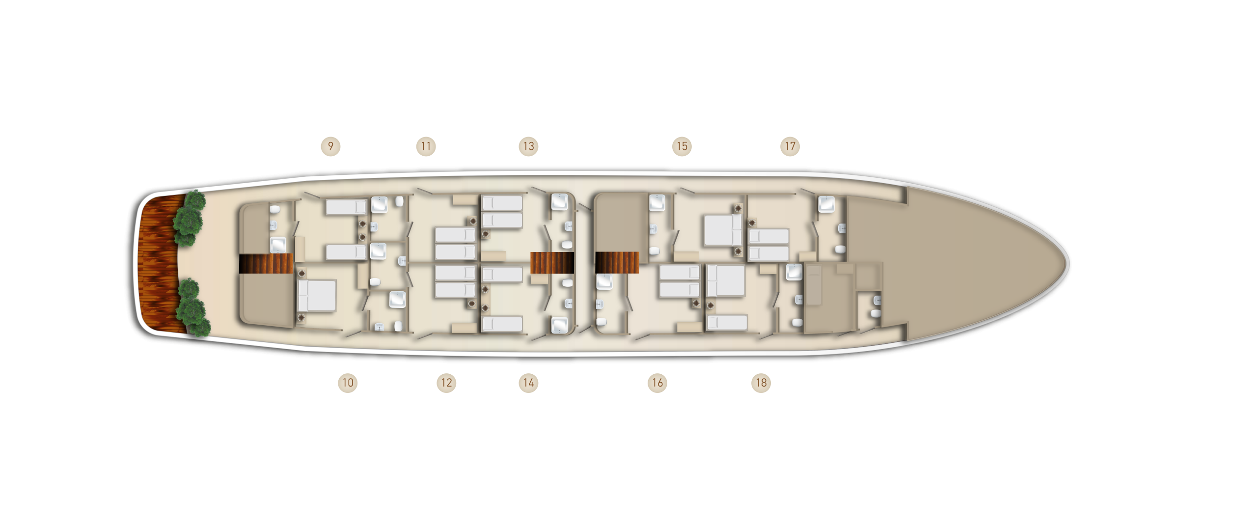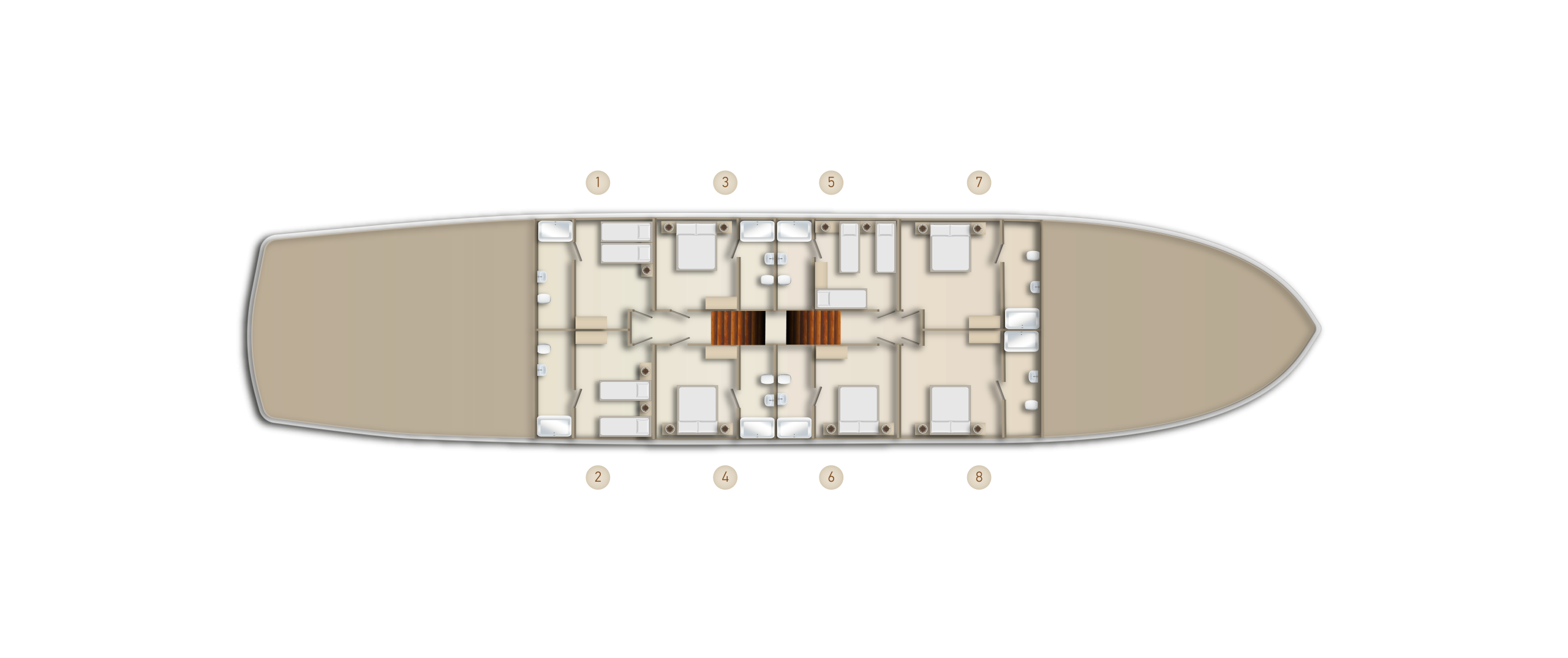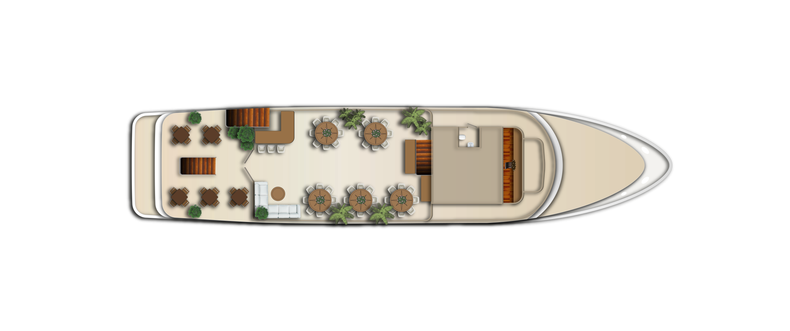 On the high deck is a sun deck that covers 250 m2 with sun-beds for all passengers. The fence is 110 centimeters high for the safety of passengers. This is the best part of the boat for those who enjoy sunbathing while part of a sun deck is shaded for clients’ comfort.