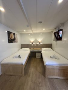 Separate sitting area with couch and table is inside restaurant as well, while outside terrace have more than 70 m2 with sitting area, tables and chairs that is fully covered of course also large enough for all passengers to have breakfast outside or just do nothing and enjoying. This area can be closed with removable plastic windows (in case of winds) but most of the time is open for a breathtaking “sea view”.